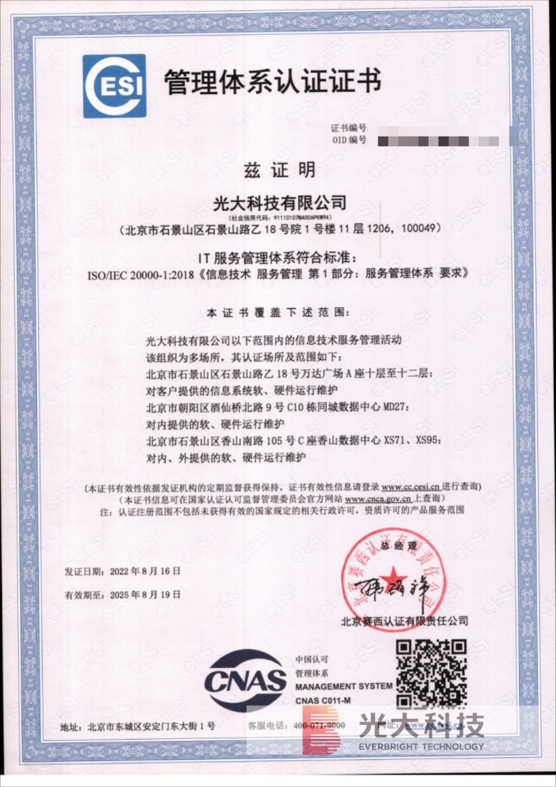 近年來,光大科技不斷優化自身管理機制,遵循IT服務管理體系、信息安全管理體系和質量管理體系,貫徹相關管理方針,得到了認證專家的一致肯定,同時也說明光大科技在合規經營的道路上為客戶信息安全、IT服務及質量把控方面的提供全面保障。