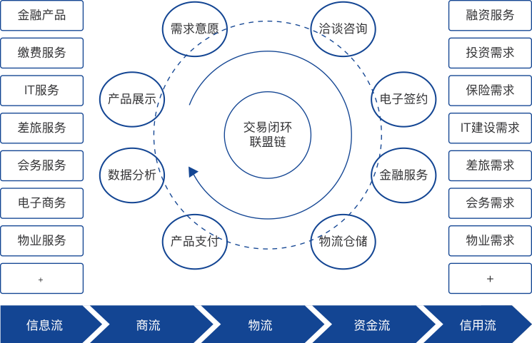 • 企業協同交易平臺通過整合大型金控集團內外部資源,實現企業客戶的協同交易,最終構建可信產業鏈,通過平臺將企業交易線上化、標準化、透明化,實現信息流、商流、物流、資金流、信用流“五流”合一。