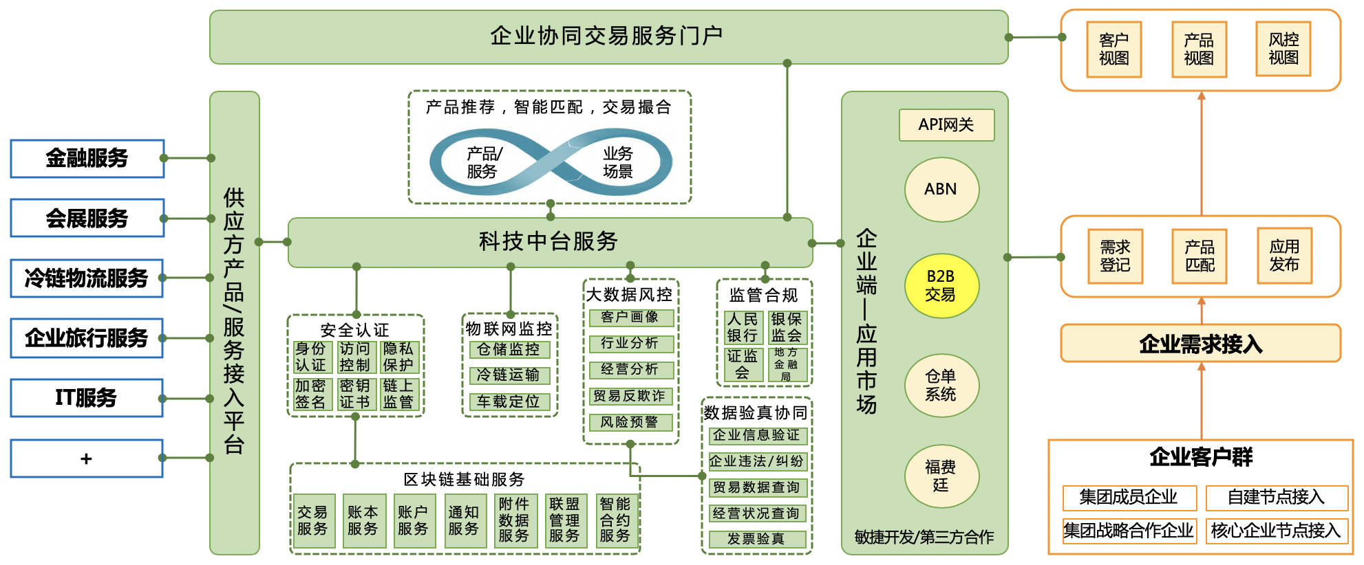 依托大型金控集團“金融+實業”的布局特色,采用區塊鏈技術,將集團內企業與外部戰略客戶的B端業務整合在一起,打造B2B協同交易平臺。打通大型金控集團產業鏈上下游,推動各產業跨界合作,著力提升客戶共享、場景融合、服務創新、數據驅動、資源整合五大能力,逐步打造具有大型金控集團特色的生態型、平臺型、科技型協同發展商業模式,基于生態場景服務為企業客戶多樣性需求提供一站式綜合解決方案。同時,B2B協同交易平臺也是大型金控集團進入產業互聯網布局的核心產品。