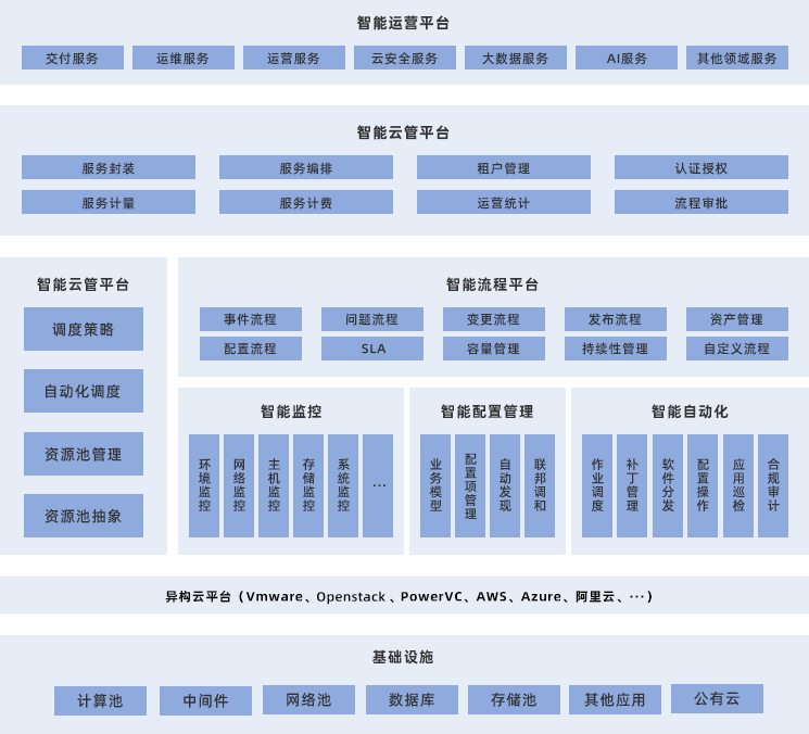 智能云管理具備承上啟下的作用,是基于云的全生命周期一體化管理解決方案。具有服務(wù)快速封裝及發(fā)布,異構(gòu)資源池的管理及智能化調(diào)度,多租戶的管理,彈性伸縮,一體化運(yùn)營的能力。