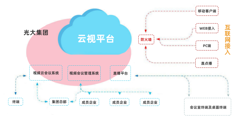 云視平臺整體包含三大模塊:視頻會議管理系統、視頻云會議系統、直播平臺。是光大科技基于第三方產品,充分利用5G和云計算技術研發成功的光大自有遠程會議整體解決方案,方案制定經過同光大銀行信息科技部等單位充分溝通,確保實現全集團視頻會議資源共享整合,光大科技對該產品擁有自主知識產權。