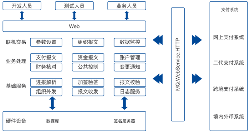 •   供用戶在線發起或接收各類交易,包括支付類交易、信息類交易、對賬類交易、清算類交易、對賬類交易、參數維護等功能。