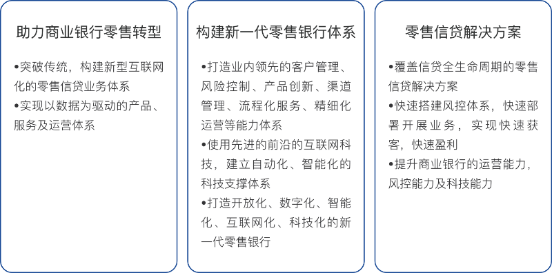 提供完整零售信貸全生命周期解決方案,助力商業(yè)銀行從無到有搭建或完善優(yōu)化零售信貸業(yè)務(wù)體系。