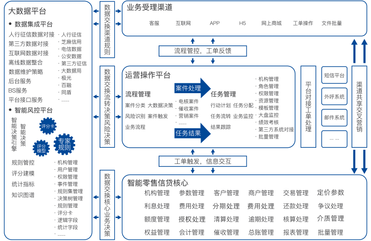 智慧零售信貸平臺(tái)是解決商業(yè)銀行在零售轉(zhuǎn)型過程中,應(yīng)對(duì)信貸業(yè)務(wù)領(lǐng)域面臨的困難與挑戰(zhàn),建立的一整套基于互聯(lián)網(wǎng)架構(gòu),充分運(yùn)用大數(shù)據(jù)、人工智能、生物識(shí)別、云計(jì)算等技術(shù)搭建的先進(jìn)的、智能的整套零售信貸業(yè)務(wù)平臺(tái)。平臺(tái)涵蓋了零售信貸業(yè)務(wù)的貸前、貸中、貸后全生命周期管理,是以客戶為中心、以數(shù)據(jù)為基礎(chǔ)、以決策為驅(qū)動(dòng),注重精細(xì)化集中運(yùn)營(yíng)管理的全自動(dòng)化、全流程化、全數(shù)字化的智慧零售信貸解決方案。